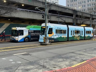 T Line train passing Pierce Transit Route 57. The Link T Line in Tacoma will be closed and replaced by free shuttle buses between 6pm on Monday (April 6) until the start of service on Friday (April...